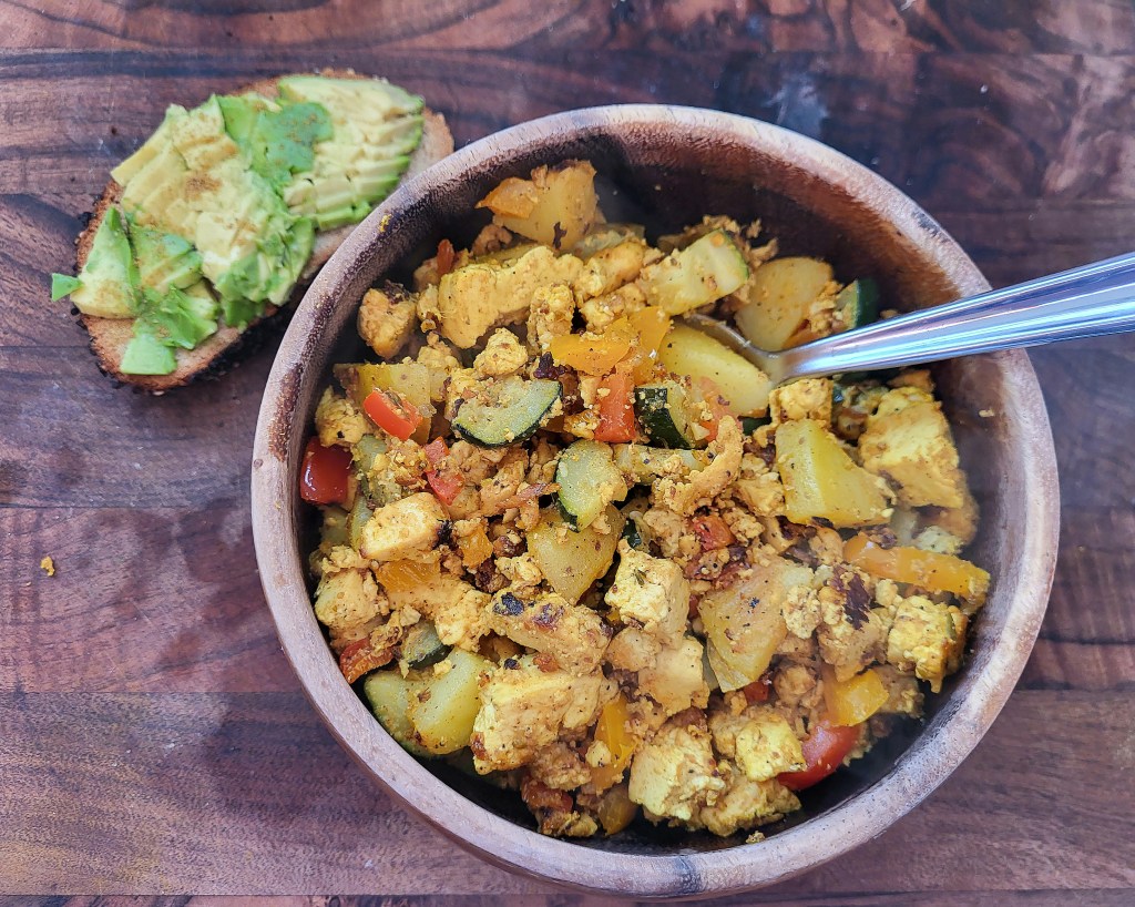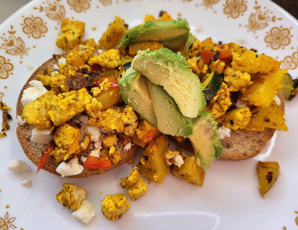5. Serve your scramble as is, topped with avocado, on top of a piece of toast or bagel!