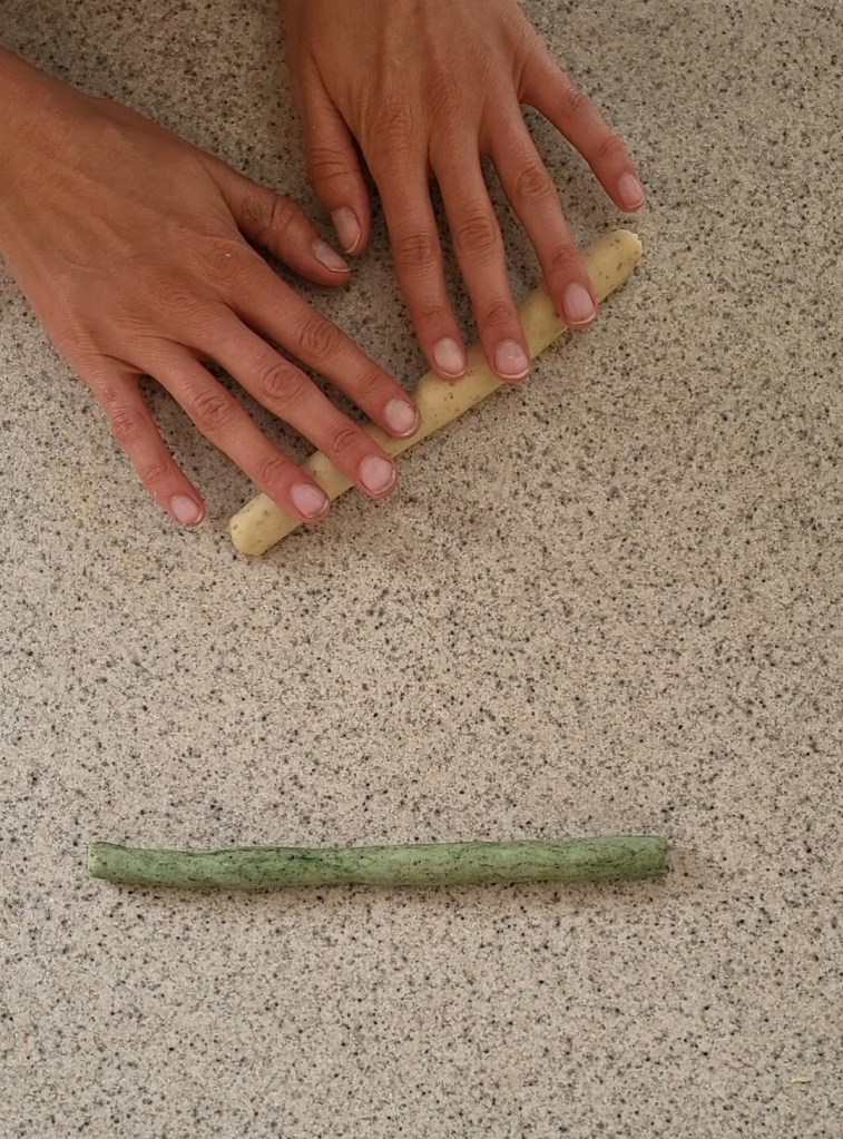 - Split your dough in half ( for white & green ) or thirds ( for white, red, and green )