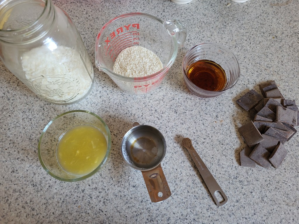 - In a saucepan on low heat add the chocolate and coconut oil. Melt slowly on low until full melted.