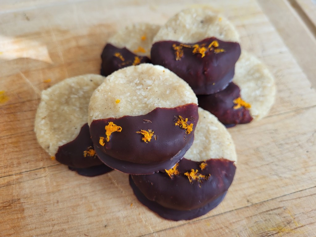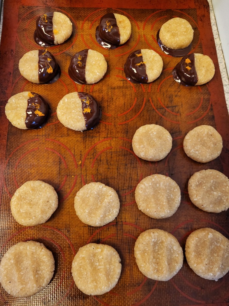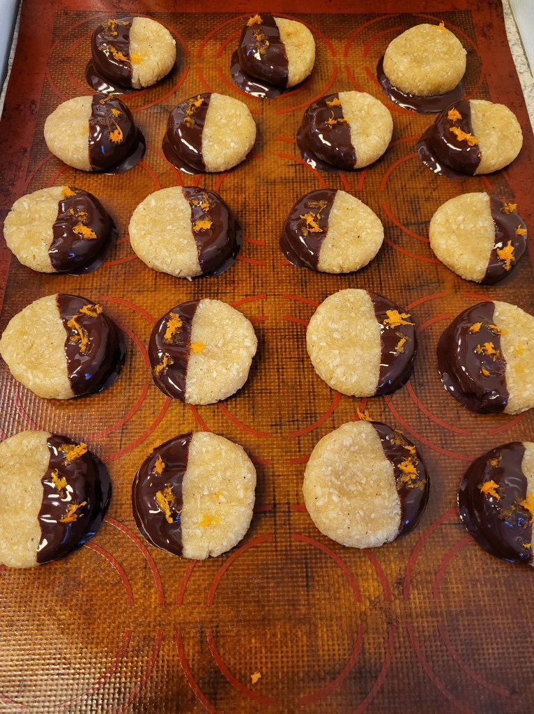 - Dip your cookies into the melted chocolate and place onto a cookie sheet with a silicone mat. Before the chocolate sets – sprinkle on a little orange zest.