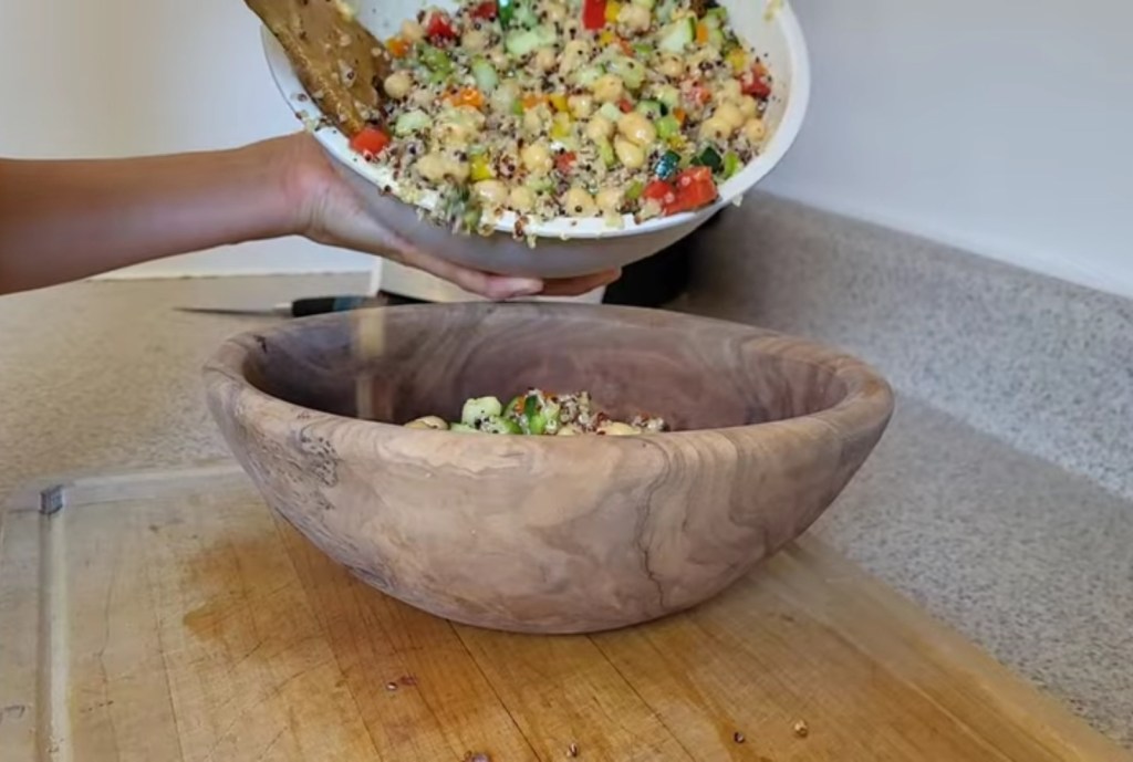 - Once the quinoa is done add into the bowl of your chopped veggies.