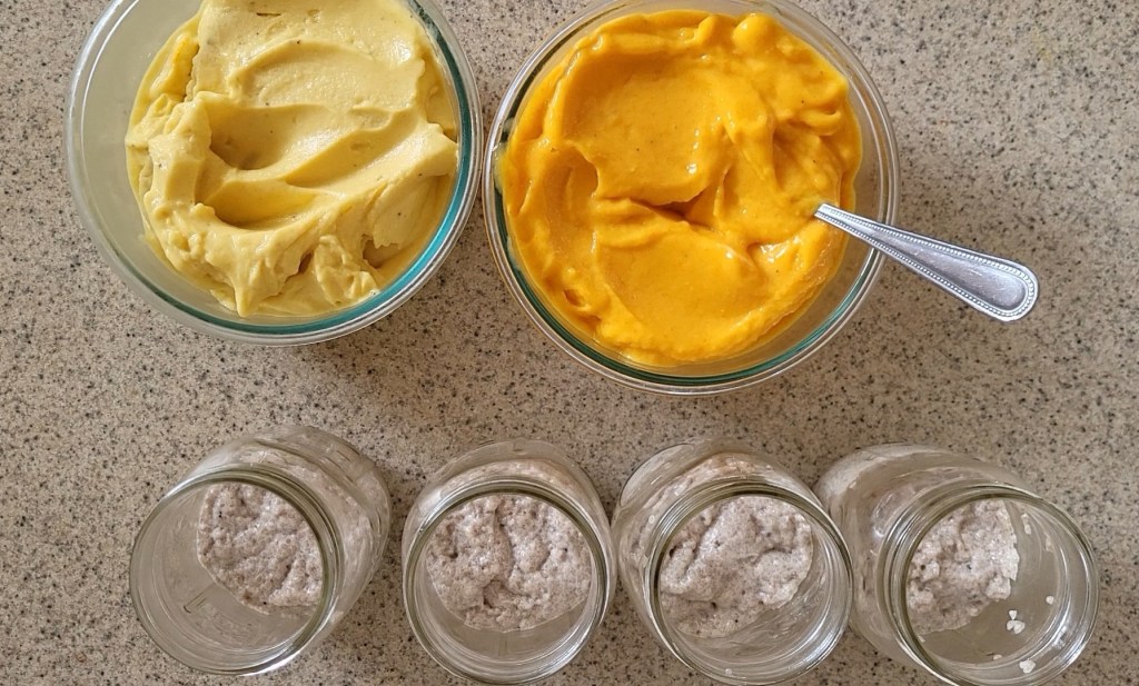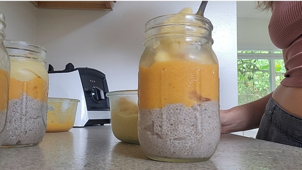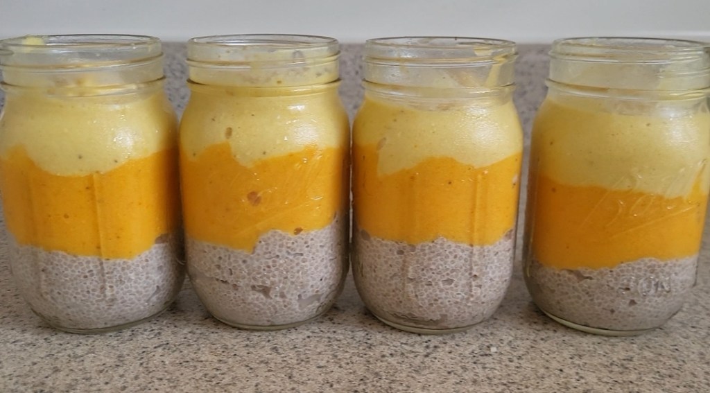 - Once you have both the orange and yellow layers made, grab your jars with chia pudding on the bottom and begin creating the orange layer on top of the chia pudding.