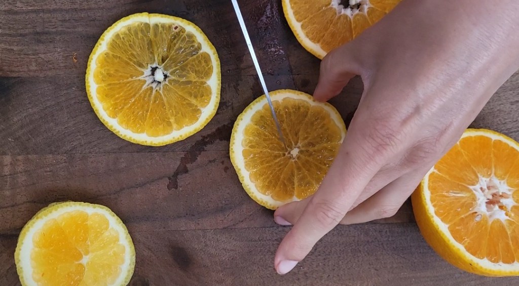 - To make the orange slice to go around the rim, keep the peel on the orange, slice thin slices of the orange. Then starting at the middle of the slice, cut one sliver from the middle to the edge of the orange slice – making sure to not cut all the way across. The sliver that is opened, goes around the rim edge of your glass / jar.
