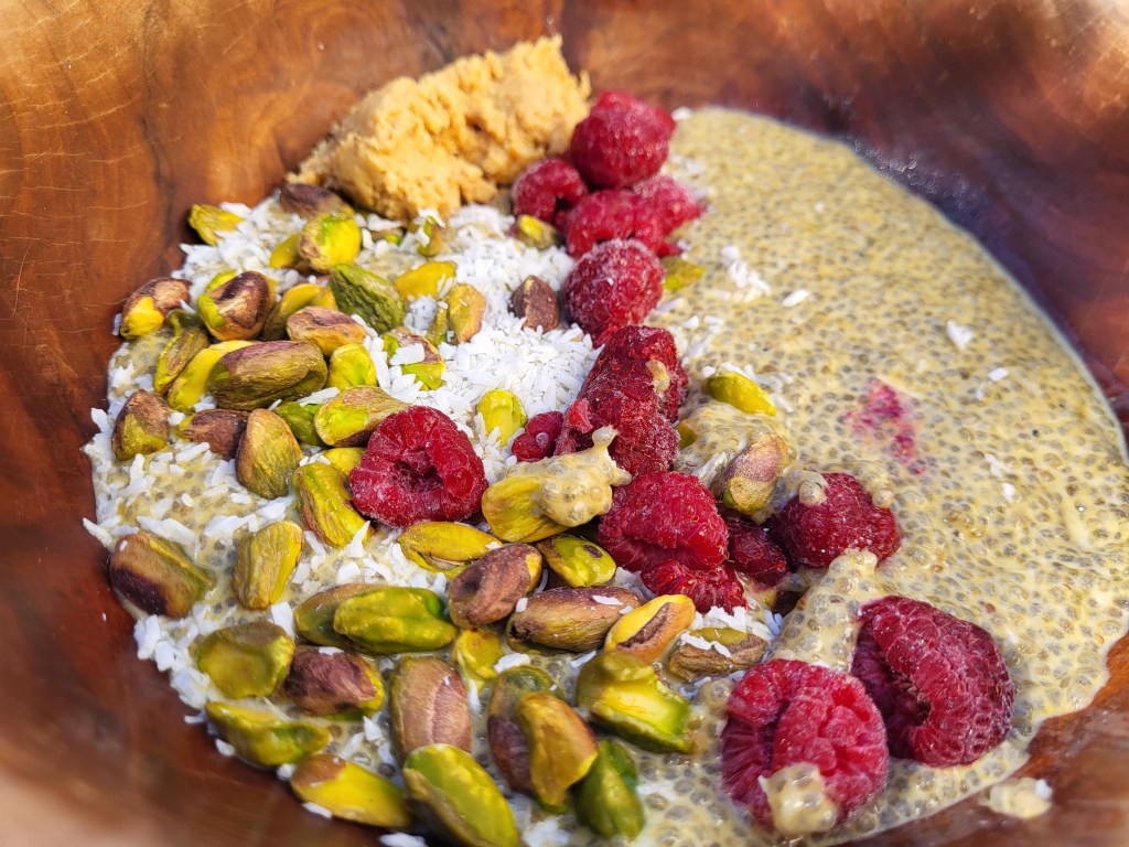 - Add the spices on top of the chia seeds. Give it a swirl to mix the spices with the seeds